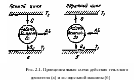 На рис.2.1 показаны принципиальные схемы действия теплового двигателя (а) и холодильной машины (б). В тепловом двигателе происходит прямой круговой процесс или цикл – последовательное изменение состояния рабочего вещества и возвращение его в исходное состояние.