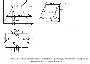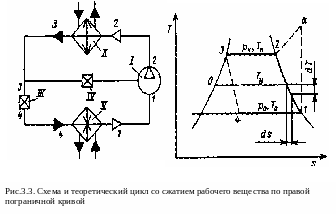 На рис.3.2 показаны принципиальная схема такой машины и ее теоретические циклы в Т–s и p–i диаграммах. Рабочие процессы рассматриваемой холодильной машины идут следующим образом: