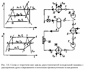 На рис. 3.8 показаны теоретические циклы двухступенчатых холодильных машин.