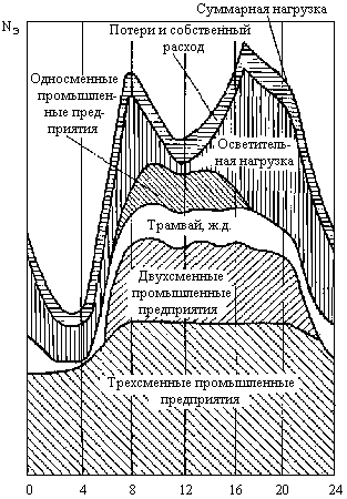 Представим типичный суточный график потребления электроэнергии крупным промышленным городом.