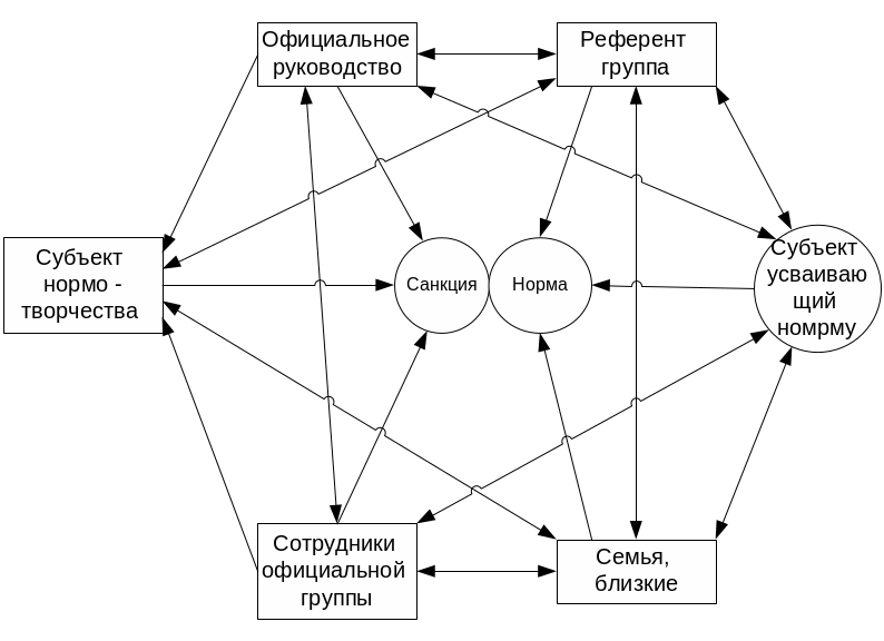 И здесь мы подходим к чрезвычайно важному для социальной и экономической психологии моменту, а именно - к определению, выяснению того, как, каким образом, посредством чего и при каких условиях (и всегда ли) внешние социальные нормы становятся внутренними регуляторами поведения и деятельности человека. Для проведения данного анализа попытаемся смоделировать обобщенную ситуацию, в которой чаще всего происходит усвоение субъектом конкретных социальных норм, культивируемых обществом и его институтами, т.е. прежде всего покажем, какие лица и органы будут так или иначе вовлечены в данный процесс {целенаправленно или спорадически, поочередно или одномоментно) и какие взаимосвязи между ними будут иметь принципиальное значение для интериоризации нормы. Данная модель, изображенная на схеме, будет выглядеть следующим образом (см. рис. 6).