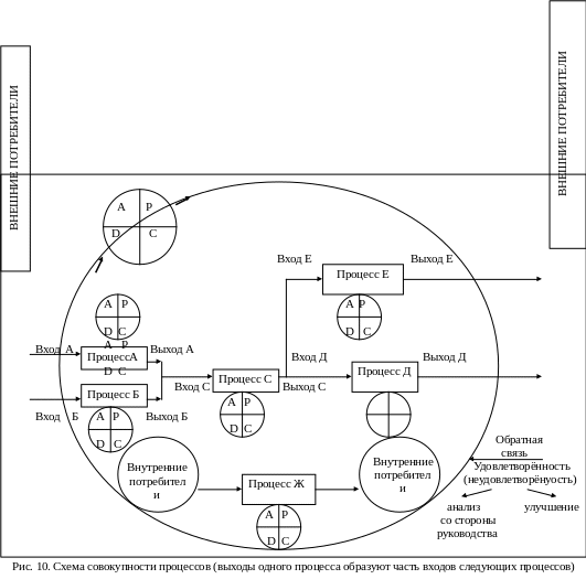 Элементы входа и выхода процессов могут относиться как к внешним (заказчик-покупатель конечной готовой продукции), так и внутренним (исполнитель следующей технологической операции) потребителям. И те, и другие играют существенную роль при определении требований к элементам входа. Обратная связь от потребителей, содержащая информацию о степени их удовлетворённости на выходе сети процессов, является входом процесса анализа продукции со стороны руководства фирмы и процесса улучшения.