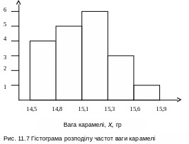 Приклад. За даними про розподіл ваги карамелі (табл. 11.5) побудовано гістограму.