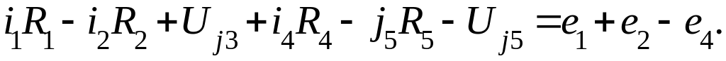 Алгебраическая сумма напряжений на всех элементах контура, кроме источников ЭДС, равна алгебраической сумме ЭДС этого контура. В левой части уравнения учитывают напряжения на сопротивлениях i*R и источниках тока Uj со знаком плюс, если произвольно выбранное направление обхода контура совпадает соответственно с направлением тока на сопротивлении и направлением напряжения на источнике тока. В противном случае – со знаком минус. В правой части уравнения ЭДС учитывают со знаком плюс, если направление обхода контура совпадает с направлением ЭДС, и со знаком минус, если эти направления противоположны.