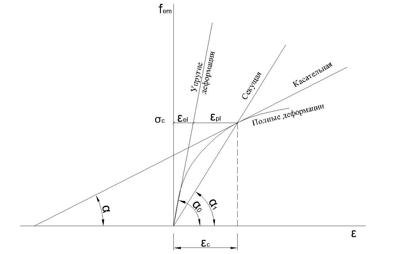 При длительном действии нагрузки в связи с развитием пластических деформаций модуль полных деформаций бетона становится переменной величиной и геометрически может быть выражен тангенсом угла наклона касательной к кривой в точке с заданным напряжением: