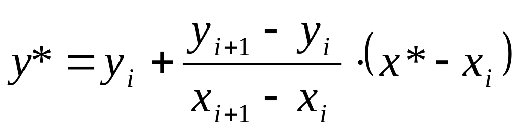 Суть линейной интерполяции заключается в замене данной функции y=f(x) на отрезке [xi, xi+1] линейной функцией. При этом xi<x*<xi+1.