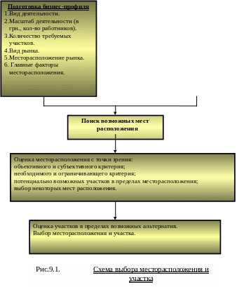 Выбор месторасположения производственных и сервисных объектов – это стратегическое решение, т.к., обычно, оно влияет в долгосрочном периоде на затраты, спрос и прибыльность. Особенно это важно для сервисных фирм: они должны сделать свои здания и оборудование доступными как можно большей группе потребителей. На рис.9.1 представлена схема выбора месторасположения и участка мощностей фирмы.