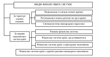 Фінансові системи держав можуть відрізнятися за своєю структурою, оскільки вони є відображенням існуючої моделі економіки, але у всіх у них є загальна ознака — це різноманітні фонди фінансових ресурсів, які різняться методами мобілізації і напрямами використання. Нині у світі налічується понад 20 різних моделей фінансових систем окремих держав.