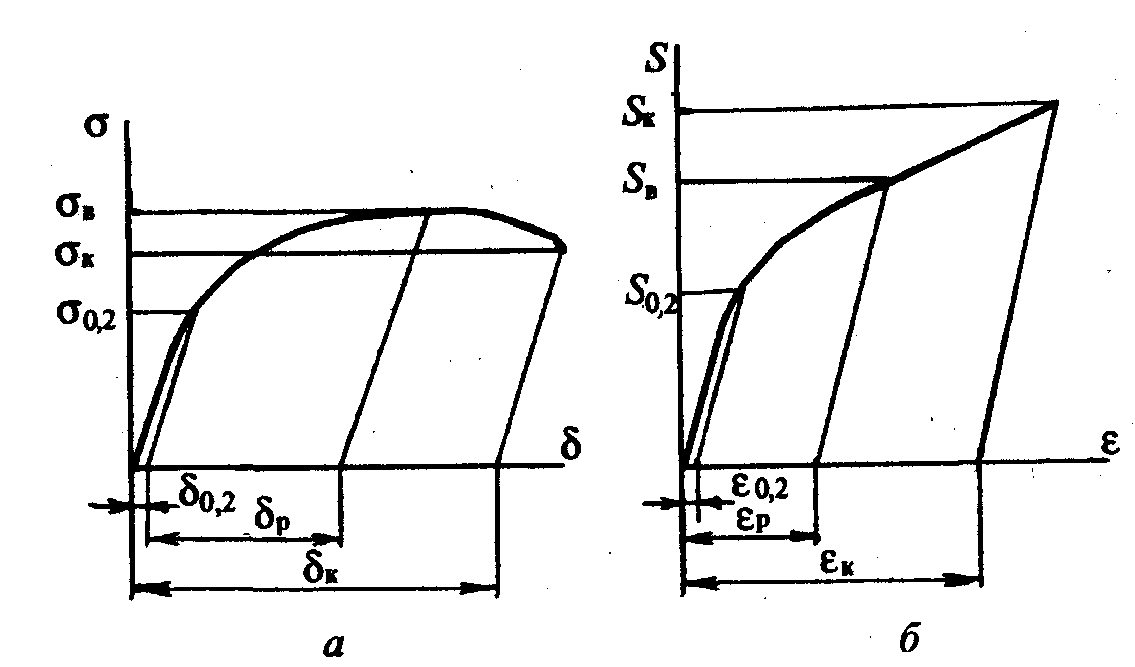 Диаграммы условных и истинных напряжений и деформаций. Протяженность первичных диаграмм растяжения вдоль осей координат Р и А/ зависит от абсолютных размеров образцов. При постоянной кратности образца чем больше его длина и площадь поперечного сечения, тем выше и протяженнее первичная диаграмма растяжения. Однако если эту диаграмму представить в относительных координатах, то диаграммы для образцов одной кратности, но разных размеров будут одинаковы. Так, если по оси ординат откладывать условные напряжения о, равные отношению нагрузки Р к начальной площади поперечного сечения Fo, а по оси абсцисс — условные удлинения 8, равные отношению абсолютного приращения длины образца A/ к его начальной длине lо, то диаграмму называют диаграммой условных напряжений и деформаций (или просто условной диаграммой). На рис. 2.9, a схематически представлена условная диаграмма о—8. На этой диаграмме отмечены условный предел текучести б0,2, временное сопротивление бв,