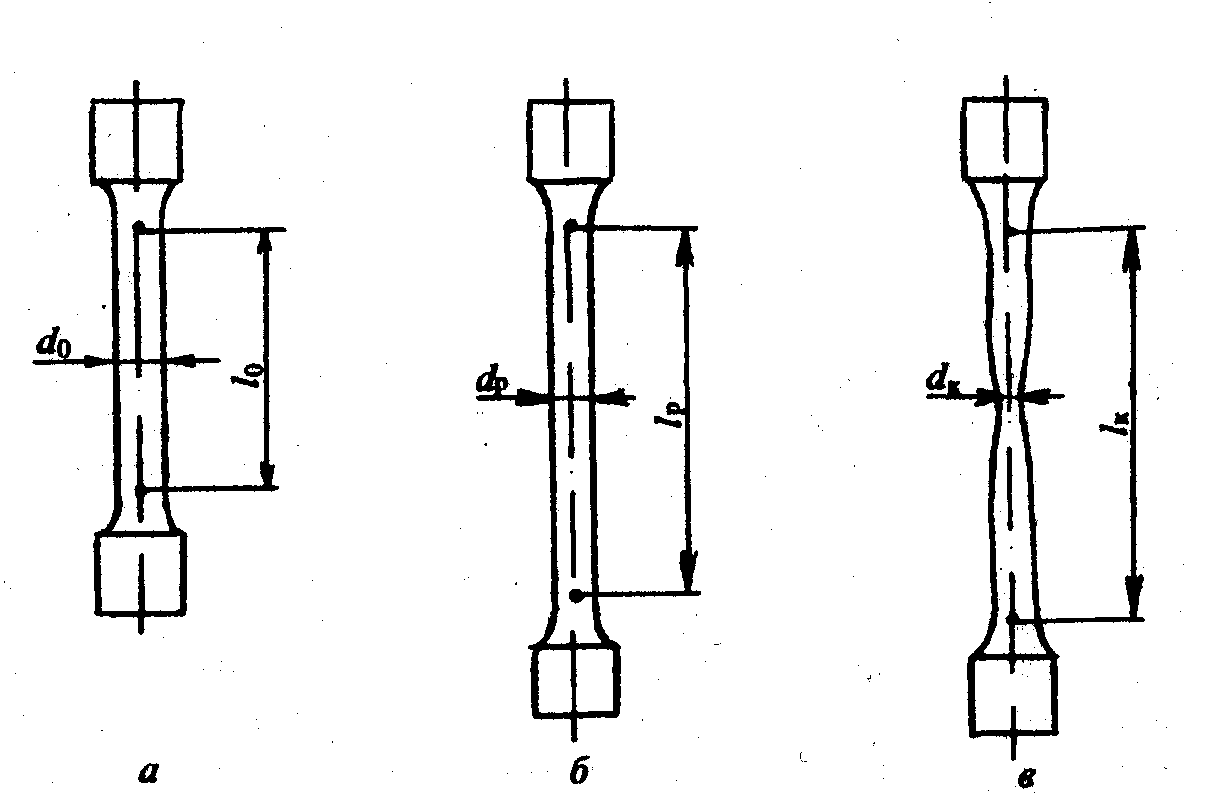 а — образец до испытания (lо и do — начальные расчетные длина я диаметр); б — образец, растянутый до максимальной нагрузки (lр и d, — расчетные длина и диаметр образца в области равномерной деформации); в — образец после разрыва (lk, — конечная расчетная длина—минимальный диаметр в месте разрыва)