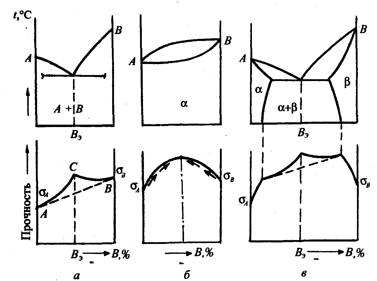 При оцінці міцністних і інших властивостей варто мати на увазі, що та частина сплаву, що представлена евтектикою, має більш високу міцність, чим частина, представлена більш великими зернами надлишкової фази. Характер залежності міцності сплавів від їхнього складу представлений на мал. 3.3, а. Тут у верхній частині зображена діаграма станів із указівкою фазового складу, а під нею показаний характер зміни міцності.
