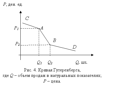 Суть действия ценовых границ в том, что при определенном соотношении цен товары-заменители, рассматриваемые как разные отраслевые рынки, могут войти в состав одного отраслевого рынка, что можно объяснить на примере ломанной кривой спроса Гутеренберга (рис. 1).