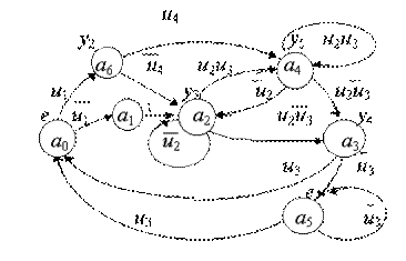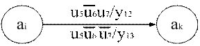 Крестики должны находиться не у выходов операторных вершин, а именно у входов следующих вершин после всех возможных слияний путей графа. В противном случае число намечаемых состояний неоправданно увеличится. Определим переходы автомата из состояния аi в аk. Для этого исследуем все пути на графе, ведущие от отметки аi к отметке аj. Из них нас должны интересовать только пути, содержащие одну операторную вершину графа. Путь через u5 не содержит операторных вершин и в данный момент не представляет интереса. Он понадобится впоследствии, когда будут просматриваться пути от аi к аj. Путь через u5u6y10y11 содержит две операторные вершины и должен соответствовать не одному, а двум переходам автомата. Остаются два пути, отвечающие поставленному требованию: u5u6u7y12 и u5u6u7y13. Заключаем, что из аi в аk должно быть определено два перехода: при ЛУ u5u6u7 с выдачей у12 и при ЛУ u5u6u7 с выдачей у13. Соответствующий подграф графа переходов автомата Мили показан на рис. 2.