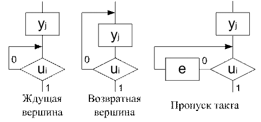 Возвратная вершина выгоднее, чем пропуск такта, так как не добавляет новых состояний, но она может быть организована только тогда, когда содержание оператора уi допускает его повторение (например, можно повторять команду сброса регистра, команду пересылки, но не сдвига или сложения). Если ждущая вершина СА находится в начале алгоритма, то проще всего режим ожидания можно организовать, соединив выход этой вершины с конечным терминатором. Во всех случаях, когда СА содержит петли с двумя или несколькими проверками логических условий (при синтезе любой модели автомата), нужно обратить внимание на правильное замыкание этих петель. Дело в том, что проверки логических условий одного перехода выполняются одновременно, и СА должна соответствовать этому требованию (рис.7).