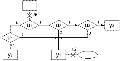 Пример 2. Здесь пара вершин соединена несколькими путями, проходящими через одну и ту же операторную вершину, но при разных ЛУ (рис.3).