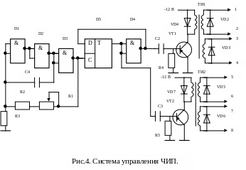 Силовая схема ЧИП представлена на рис.1. Фактически это схема однофазного мостового инвертора, нагрузка Zн которого включена на стороне постоянного (пульсирующего) тока. В схему включены следующие элементы: VS1...VS4 - силовые тиристоры, C1 - коммутирующий конденсатор, L1 - коммутирующий дроссель.