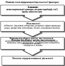 Проте однієї мотивації недостатньо для започаткування власної справи. Необхідні також сполучення трьох основних факторів - бажання людини, її можливості заняття підприємництвом та відмова від попереднього образу життя (рис.1.4).