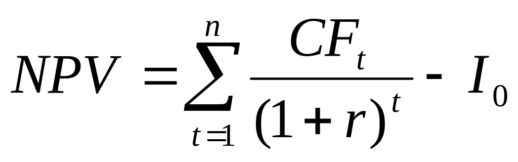 Пусть I0 – сумма первоначальных затрат, т. е. сумма инвестиций на начало проекта; PV – современная стоимость денежного потока на протяжении экономической жизни проекта. Тогда чистая современная стоимость равна:
