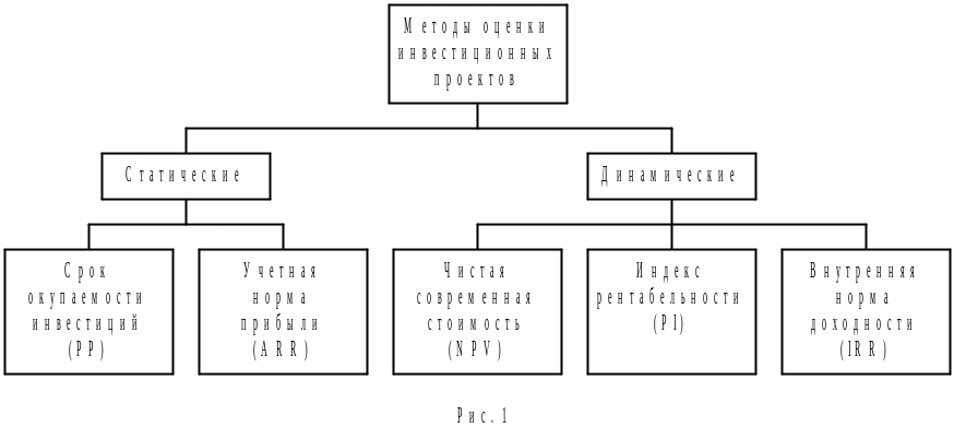 Одним из ключевых моментов при принятии инвестиционных решений является оценка эффективности предполагаемых вложений. Изученные на предыдущих занятиях методы исчисления характеристик денежных потоков являются тем фундаментом, на котором также базируются и современные методы анализа эффективности инвестиционных проектов. Данные методы можно разбить на две группы: динамические (учитывающие фактор времени) и статические (учетные) (рис. 1).