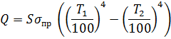 При лучистом теплообмене между двумя параллельными поверхностями со степенями черноты ε3 и ε2, имеющими соответственно температуру T1 и Т2 количество энергии, которой они обмениваются, определяют по формуле