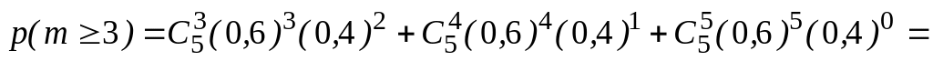 Вероятность попадания для стрелка постоянна, и равна 0,6. С какой вероятностью при 5 выстрелах он поразит мишень не менее 3-х раз; какое среднее количество попаданий?