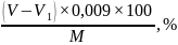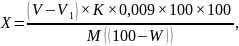 где X – массовая доля редуцирующих веществ в патоке в пересчете на сухие вещества, %; V – количество 0,1 М раствора тиосульфата натрия, пошедшее на титрование 25 см3 0,1 М раствора иода (контрольный опыт), см3; V1 – количество 0,1 М раствора тиосульфата натрия, пошедшее на титрование остатка иода после взаимодействия с редуцирующими веществами патоки, см3;К – поправочный коэффициент 0,1 М раствора тиосульфата натрия; 0,009 – количество глюкозы, соответствующее 1 см3 0,1 М раствора иода или 0,1 М раствора тиосульфата натрия, г: М – масса патоки, взятая для определения редуцирующих веществ, г; W – массовая доля влаги в патоке, %.