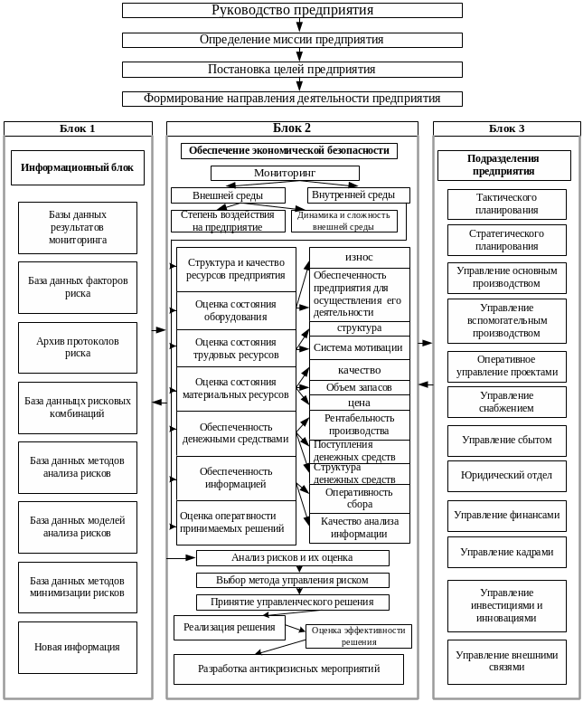 блок идентификации, оценки и подтверждения целесообразности принятия решения относительно экономической безопасности предприятия, включая контроль и разработку антикризисных мероприятий.