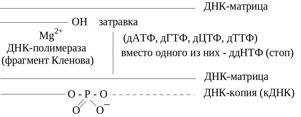 ддНТФ – «брачный» нуклеозидтрифосфат (2’,3’-дидезоксирибонук-леозидтрифосфат): в связи с тем, что в положении 3’ монозы отсутствует ОН-группа, такой нуклеотид не способен к образованию 3’-5’ фосфодиэфирной связи, поэтому происходит обрыв синтезируемой цепи ДНК. Например, структура ддГТФ: