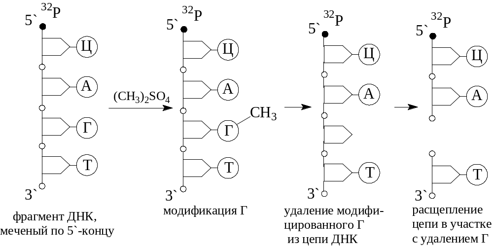 химический метод (1977 г.): А. Максам и В. Гильберт предложили избирательно расщеплять цепь ДНК по месту модифицированных пуриновых и пиримидиновых оснований (одного или двух): 5’ или 3’-конец ДНК метится радиоактивным изотопом 32Р, затем цепь ДНК обрабатывают специальным химическим веществом (например, диметилсульфатом (СН3)2SO4), вызывающим структурные изменения в одном из азотистых оснований, что приводит к обрыву цепи по месту модификации азотистого основания (например, Г).