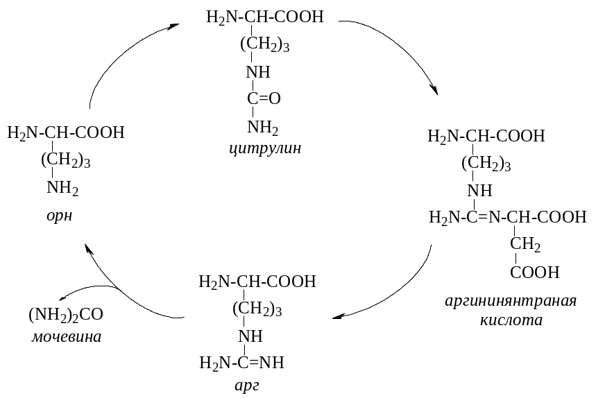 Мочевина – основной конечный продукт белкового обмена у многих животных (дождевой червь, лягушка, акула, черепаха, все млекопитающие). Ее биосинтез протекает в печени (М. В. Ненцкий, И. П. Павлов). Цепочка реакций, приводящих к образованию мочевины, называется орнитиновым циклом.