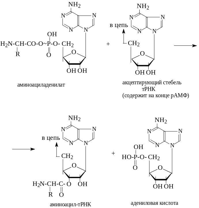 Аминоациладенилат взаимодействует с акцептирующим стеблем тРНК с образованием аминоацил-тРНК и адениловой кислоты: