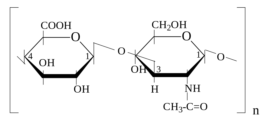 Гиалуроновая кислота. Мономеры – -D-глюкуроновая кислота и 2-N-ацетил--D-глюкозамин. Связи – попеременно 13 и 14. Важнейшая составная часть межклеточного вещества тканей животных. Содержится в коже, сухожилиях, стекловидном теле глаза. Основная функция в организме – связывание воды с образованием желеподобного матрикса.