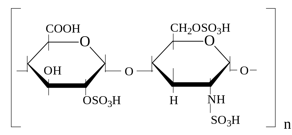 гетерополисахариды (содержат остатки моноз 2 и более видов): гиалуроновая кислота, гепарин |