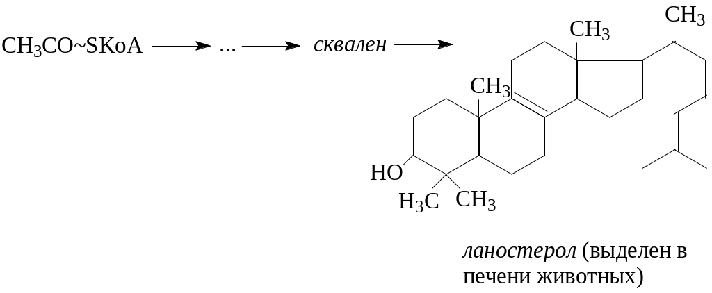 Синтез стероидов. Долгое время был загадкой. В настоящее время этот путь отслежен, но труден для запоминания. Основная схема включает в себя окислительно-восстановительные реакции (фермент: редуктаза), перенос групп (фермент: трансфераза), изомерию (фермент: изомераза), гидролиз (фермент: гидролаза):