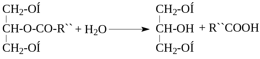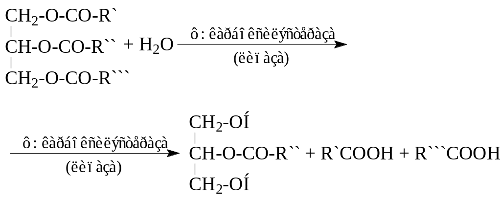 Распад жиров. Жиры распадаются в ходе гидролиза, который протекает ступенчато: сначала гидролизуются внешние -связи, а затем внутренняя -связь.