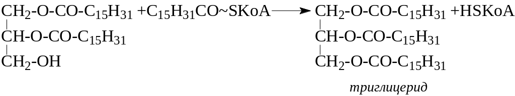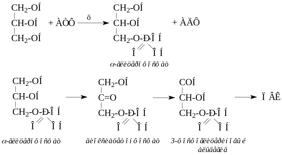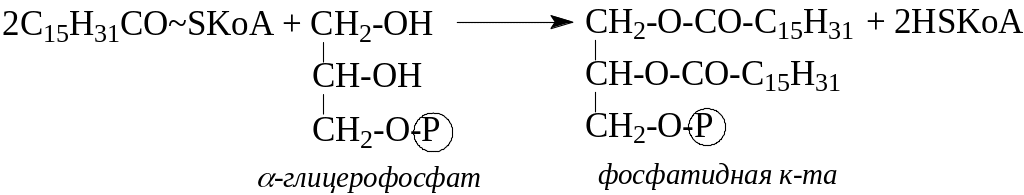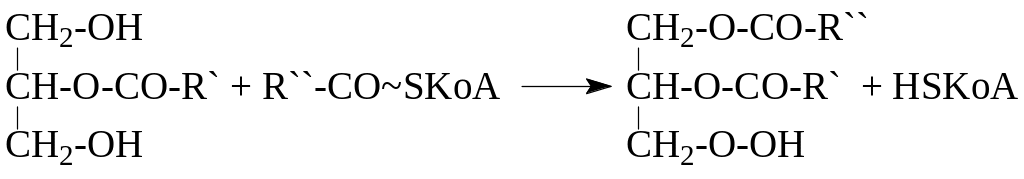 В последние годы доказана другая схема синтеза жиров: реакция трансацилирования (фермент: ацилтрансфераза), большую роль играют -глицерофосфат и ацилкоэнзим А (коэнзим А, связанный с остатком кислоты).