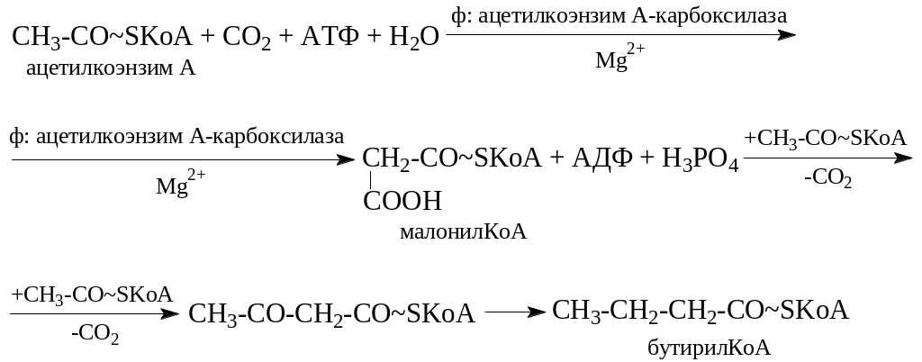 Синтез высших жирных кислот. Долгое время считали, что синтез жирных кислот – цепочка реакций, обратная их -окислению, но согласно современным представлениям (работы Ф. Линена и сотр.), в синтезе активную роль играет СО2.