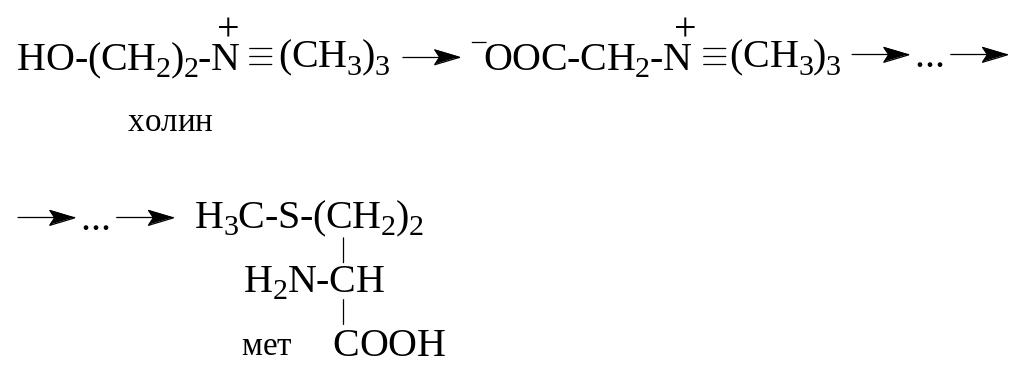Распад фосфолипидов: гидролиз до глицерина, ортофосфорной кислоты, жирных кислот и азотистых оснований. Распад азотистых оснований, например, холина: