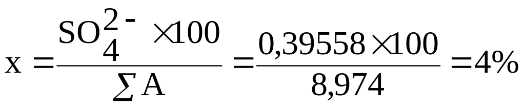Сума аніонів (∑А), що дорівнює 8,974 приймаємо за 100%, а HCO3- у мг-екв/ дм3, що дорівнює 6,556 приймаємо за х (%-екв/ дм3) тоді: