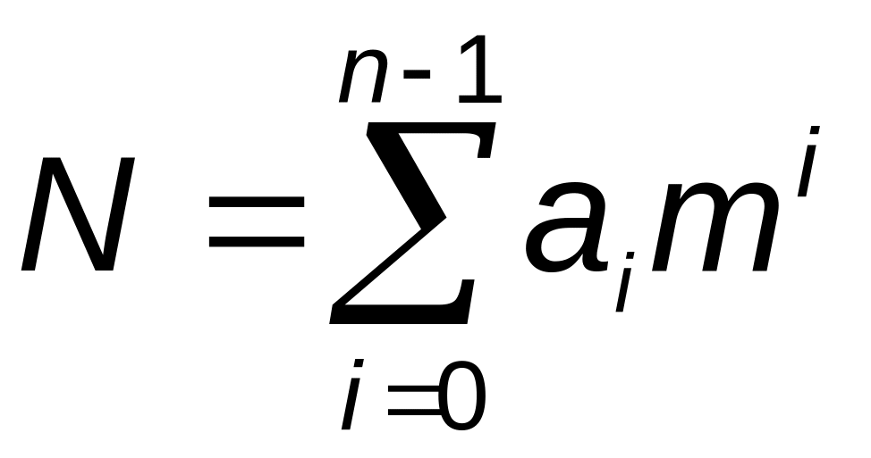 де m — основа системи числення; аі — значення розрядного коефіцієнта і-го розряду (тобто множник, який приймає значення 0 … m – 1 і показує, скільки одиниць і-го розряду міститься в числі); n — розрядність числа (довжина коду).