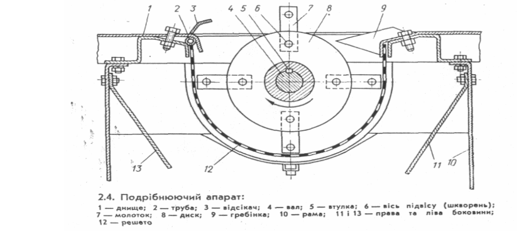 1- днище; 2 - труба; 3 - відсікач; 4 - вал; 5 - втулка; 6 - вісь підвісу (шкворень); 7 - молоток; 8 - диск; 9 - гребінка; 10 - рама; 11 і 13 - права та ліва боковини; 12 - решето