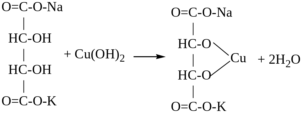 В пробирку помещают 5-6 капель 10%-ного раствора гидроксида натрия, 1-2 капли 5% раствора сернокислой меди СuSО4 и 8-10 капель сегнетовой соли (двойная соль калия натрия виннокаменной кислоты). Происходит растворение гидрата окиси меди с образованием алкоголята меди синего цвета. Химизм реакции:
