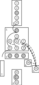 Для представления информации о структуре технологического процесса формируют технологический граф – графическую модель процесса, наглядно отображающую последовательность выполнения операций и взаимосвязи между ними. Порядок расположения материалов или деталей в строке должен обеспечивать отсутствие пересечений между дугами, соединяющими вершины графа. Вершины графа соответствуют технологическим операциям. Их оформляют в виде окружностей, в ячейках которых проставляют номер операции, специальность/разряд, время, класс оборудования. Дуги образуют цепочки и иллюстрируют последовательность действий по соединению деталей кроя в части изделия и в изделие.