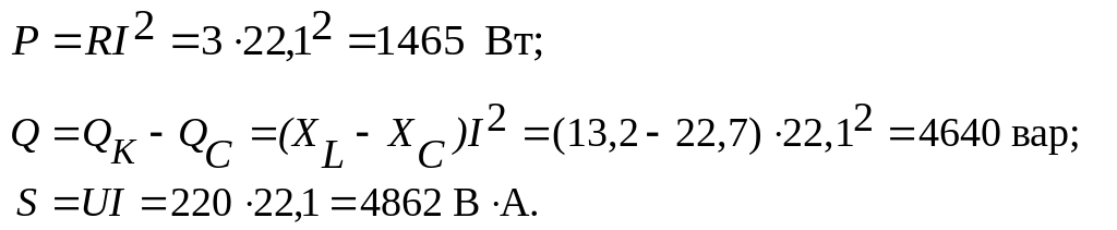 Визначаємо, відповідно, активну, реактивну і повну потужності кола: