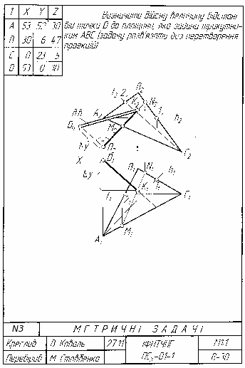 Визначити дійсну величину відстані від точки D до площини, яка задана трикутником АВС (задачу розв’язати без перетворення проекцій).
