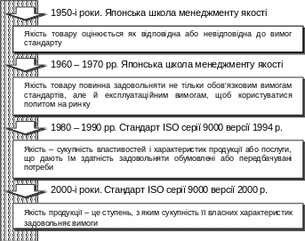 Якщо в 50-і роки ХХ століття якість оцінювала як відповідна або невідповідна до вимог стандарту [41], то на етапі 1990-х років Міжнародна організація зі стандартизації (ISO) трактувала якість як сукупність властивостей і характеристик продукції або послуги, що додають їм здатність задовольняти обумовлені або передбачувані потреби (стандарт ISO серії 9000 версії 1994 р.) [30].