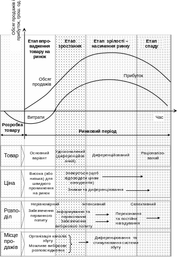 Рис. 10.1. Типовий графік життєвого циклу товару в співвідношенні з елементами комплексу маркетингу