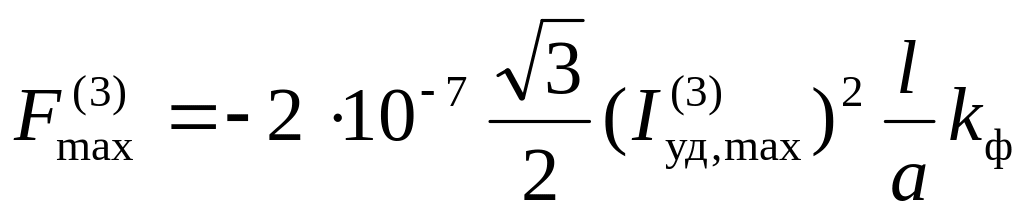 Наибольшие электродинамические силы действуют на среднюю фазу (расположение шин в одной плоскости) при трехфазном КЗ и поэтому принимаются за расчетные: