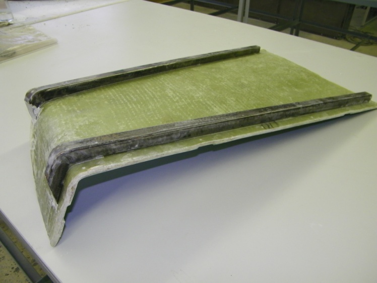 После полной полимеризации облой ламината на стыках и обводах матрицы необходимо срезать и в ослабленных местах дополнительно выполнить дополнительную склейку клеем ВК – 9 вставок стеклоткани по плоскости матрицы и металлического каркаса. Предварительно места нанесения соединительного ламината покрывают праймером и уже после его полной полимеризации изготовляют соединительный ламинат, покрывающий всю конструкцию каркаса. Нахлест соединительного ламината на поверхность матрицы и металлического каркаса должен составлять до 100 мм в зависимости от габаритов и веса матрицы, а толщина ламината – 2÷7 мм при тех же условиях.