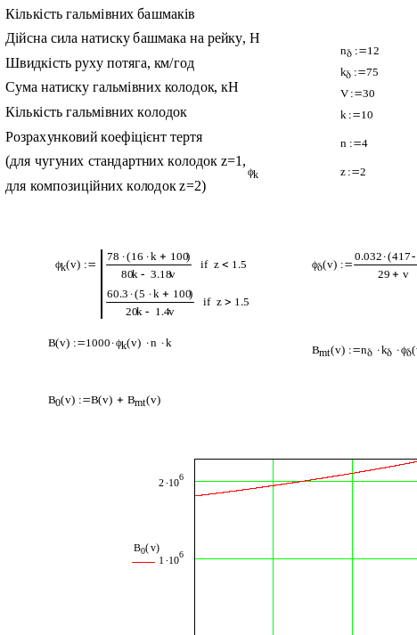Визначення гальмівного шляху у залежності від швидкості руху електровоза проходить за допомогою програми Mathcad. Запустіть за допомогою Mathcad файл lab2.mcd. Відкриється вікно програми, де потрібно замінити попередні дані на значення, підготовлені в попередньому розділі. У результаті отримаємо графіки шуканої нами залежності.